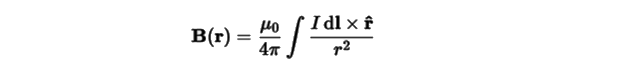 Where dl is the elementary length vector of the conductor, r is the vector from the conductor segment to the point of interest, and μ₀ is the vacuum permeability.